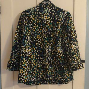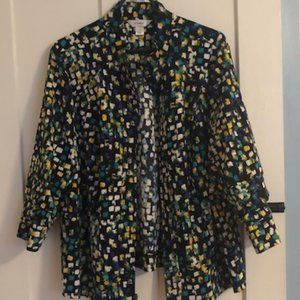 This is a women's CJ Banks zipper jacket. It has a cool green, yellow and white design on it and it has also quarter sleeves. This jacket is a size 1X and the shell is made out of 97% polyester and 3% spandex. The lining is made out of 100% polyester. This jacket is in excellent condition with no rips, tears or stains.
