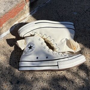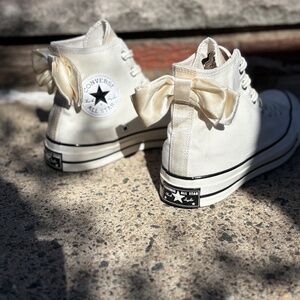 Cute egret Chuck 70s with satin bows. Been used a couple times but they dont match with any of my clothes so and i dont like the way they look on me so i dont wear them anymore. There is some damage on the back side of the bow on one of the shoes but it's not visible at all glance.