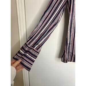 This Women's C&W Striped Blouse in size 4P is a classic and versatile piece suitable for casual occasions. The long sleeves, collared neckline, and button closure add a touch of sophistication to the basic style. The multicolor stripes offer a fun and stylish accent, while the petite fit ensures a comfortable and flattering silhouette. Easy to care for with its machine washable design, this blouse is a must-have for any wardrobe, whether it's for winter, spring, summer, or fall.
