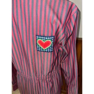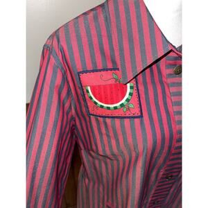 This shacket is in excellent condition! No rips or stains! It features a watermelon patch on the front and a heart patch on the back! The stripes are black and red, and the buttons are a dark gold/bronze color! The back has rouching details. This would be so cute to wear with leggings, jeans, or even dress pants! Measurements in photos. Womens size medium!