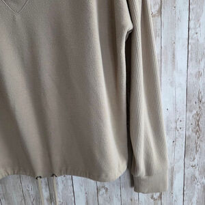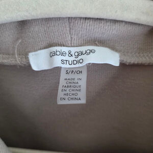 This women's Cable & Gauge Studio sweater, size S/P/CH, is a solid beige color. It features a cowl neck with a V-stitch detail on the front. The long sleeves are ribbed with ribbed cuffs. The bottom hem is adjustable with a drawstring, featuring visible ties and black toggles. The main fabric is composed of 70% Polyester, 28% Viscose, and 2% Spandex. The garment appears to be in new condition with no visible signs of wear.