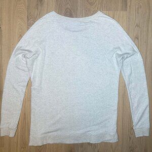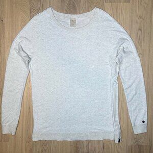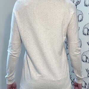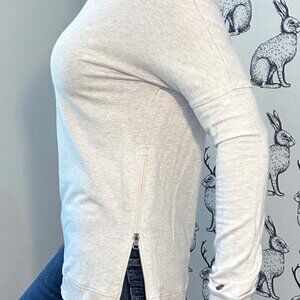 Soft light-weight tunic sweatshirt, more of a thick long sleeve top. Long tunic like length. Round, almost more of a boat neck style neckline. Drop shoulder seam detail at arms. High zippered vent at side seam.
