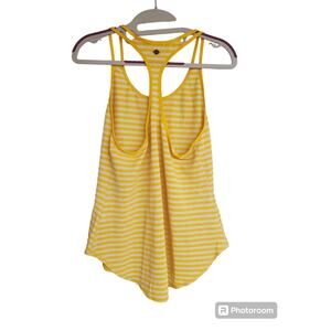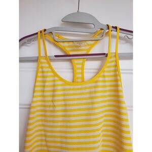 Excellent condition, women's Calia by Carrie Underwood athletic tank top in a yellow striped pattern. This material is textured and stretches! This top has a rounded bottom.