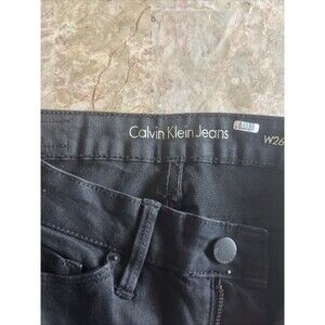 The Women's Calvin Klein Black Denim Jeans in size 26x32 Ultimate Skinny are a stylish and trendy addition to any wardrobe. These high-rise, slim-fit jeans feature a dark wash and solid black color, with a vintage 90s theme. The denim fabric is adorned with a distinctive distressed look, adding a touch of edgy flair. The Calvin Klein brand ensures quality and sophistication, making these jeans a versatile choice for everyday wear.