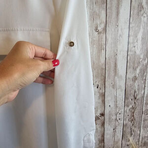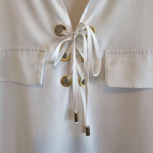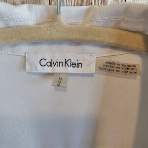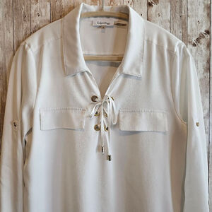 This is a pre-owned white long-sleeved blouse by Calvin Klein. It features a lace-up detail at the neckline with gold grommets and a curved hemline. The blouse has two patch pockets on the front and button closures at the cuffs. The fabric is a lightweight, silky material. The blouse is in good condition with no visible stains or tears. The size is M.
