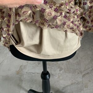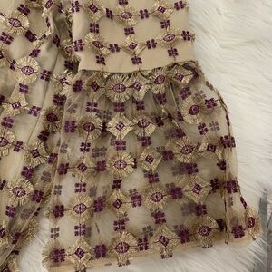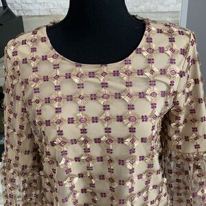 Women’s Tan Underlayer Slip Blouse with Maroon Decorative Chiffon Overlay. Unique in design with Wide Bell like Mid Elbow Sleeves. Gently Worn Size XS (95)