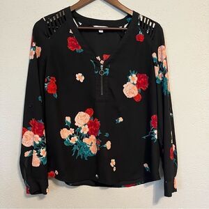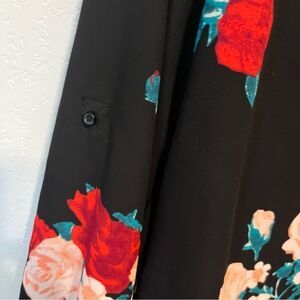 Long Sleeve Black Blouse Shirt with Red and Pink Roses with Green Leaves Button Tab Sleeves can be rolled up or cuffed to 3/4 sleeves Size Medium Silver Zipper Front V-Neck Cute for Christmas Valentine's Holidays or any time