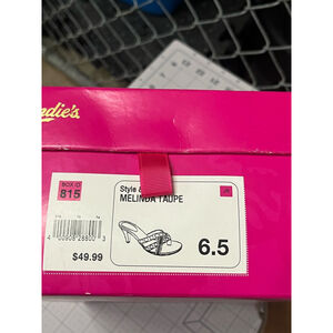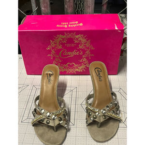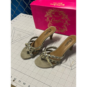 Pre-owned Candie's 'Melinda Taupe' heels, size 6.5. These thong-style heels feature a taupe-colored upper with decorative silver and gold-tone embellishments. The heels are approximately 2.5 inches tall. The shoes show signs of wear, including minor scuffs on the soles and slight discoloration on the insole. The original pink box is included, showing some shelf wear.