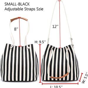 Dimensions - Canvas Tote Small 10''L x 9.5''H x 5.5''W, weights 300g; long strap maximum Length 33''. Canvas Tote Medium 13"L x 12"H x 7"W, weights 400g; long strap maximum Length 39''. With its all-match style and supreme quality, it is sure that our stylish stripe canvas bag will be fashionable and classic however you decide to use in various occasions. Two Color Available: Black / Navy.