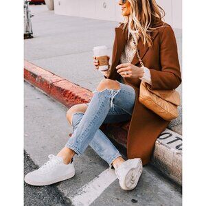 Features: notched lapel, v neck, two side pockets, knee length, solid color, slim fit, long sleeve