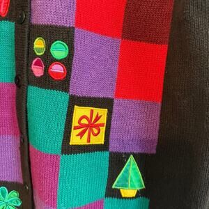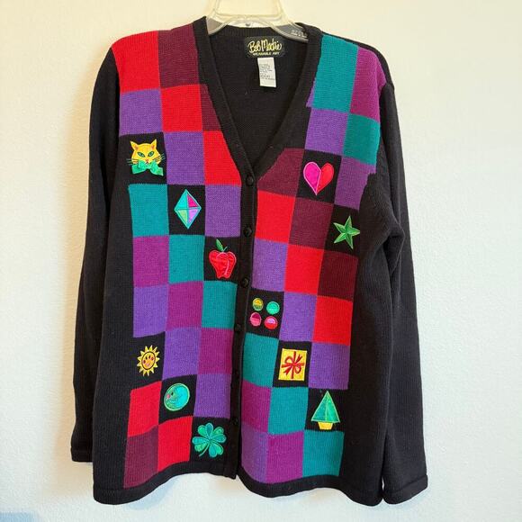 Womens Cardigan Sweater Size Large Bob Mackie Cat Heart Checkered Embroidered