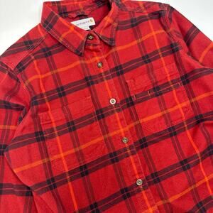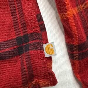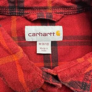 Women’s Carhartt Flannel Button Front Shirt. Red, orange and black plaid. Cotton/spandex blend. Two front pockets. Womens size Medium (8-10). Good used condition.