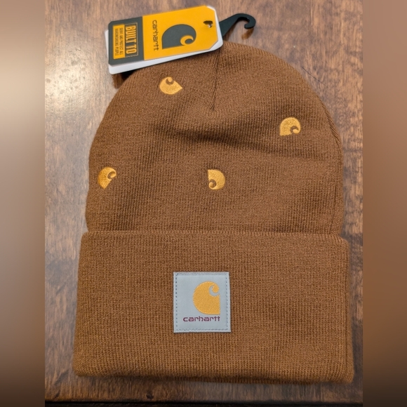 Cozy Carhartt beanie in tan. Features signature logo patch. Perfect for warmth and style.