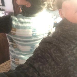 A relaxed fit jacket that is so much more than it seems. The contrasting knit back is what will turn heads and bring you countless compliments. With 58% tencel out of sustainable wood pulp, this soft to the hand dorado twill fabric will seal the deal. Large. Moss colored. Loose Fit. Military Styled Front. Chest and Front Side Pockets with Snap Closures. Dorado Twill. 58% Tencel, 38% Cotton, 4% Spandex. New With Tags