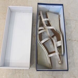 PRE-OWNED in excellent condition (box included). Caslon leather "Paola" wedge scrappy sandals in pretty gold "platino" color - size 8.5M. Please see photos for design, color and measurement details. SMOKE AND PET FREE HOME. Please contact me with any questions. Thank you.