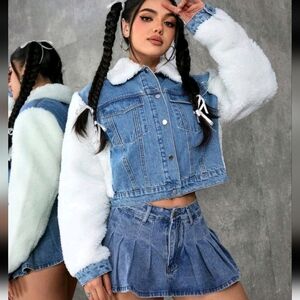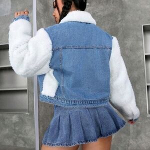 Women's Casual Contrast Color Furry Patchwork Cropped Denim Jacket