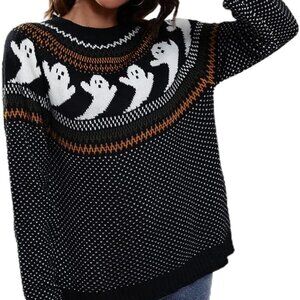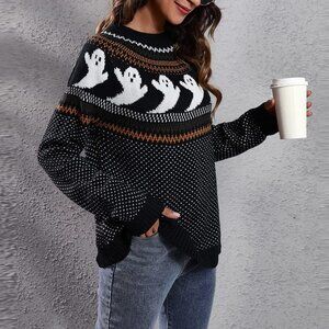 Features: cute ghost print, long sleeve, round neck, gothic style, ribbed neckline, cuff and hem, loose knitted streetwear, Halloween sweater top