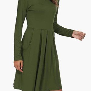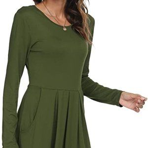 FEATURES: Plain pleated swing dress, Solid color, Casual loose fit long sleeve tunic dress, Hits the knees t-shirt classy dress with pockets, Party dance O-neck t-shirt dress.