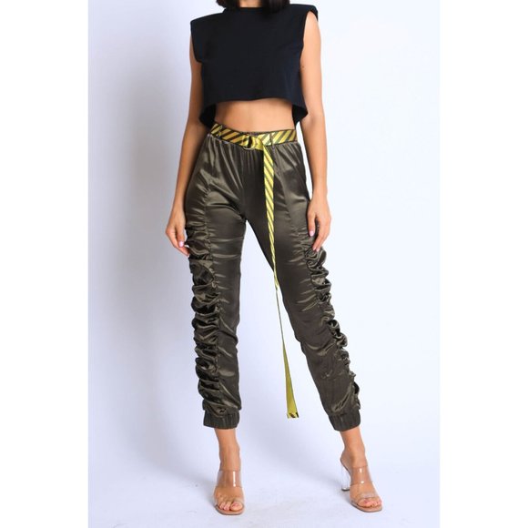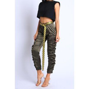 Women's Casual Satin Shirring Long Cuffed Pants With Belted Daily Outdoor Comfy