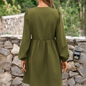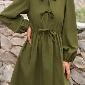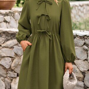 FEATURES: S=US 4-6, M=US 8-10, L=US 12-14, XL=US 16-18, XXL=US 20 / Long Lantern Sleeve / Bow Tie Front Dresses / Crew Neck / Hidden Buttons / Side Pockets / High Waist / A Line / Solid Color / Short Dresses / Babydoll Dress / Oversize Loose Fit / Knee-Length