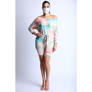Women's Casual Tie dye Mask & Off The Shoulder 3/4 Sleeve Romper Set S,M,L
