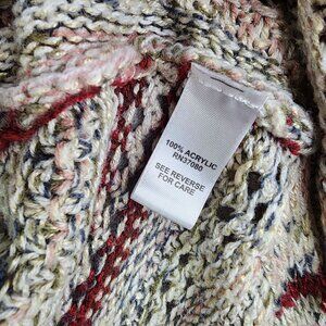 This sleeveless cardigan vest offers an open-knit design in a blend of beige and red tones, tailored for those seeking comfort and style. Crafted from 100% acrylic, it provides softness and durability. The vest is suitable for sizes 22/24, making it an ideal addition to a versatile wardrobe.