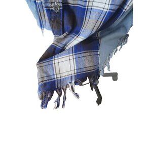 Elevate your casual style with this women's Cato top featuring a blue plaid and chambray frayed hem design. The 3/4 sleeve, collared neckline, and button-up closure add a touch of sophistication, while the 100% cotton material ensures comfort and machine washability for easy care. This top is perfect for any occasion, whether it's a day out running errands or a casual evening with friends. The size is L, and it's a regular fit. Get ready to turn heads with this unique and stylish button-up top!