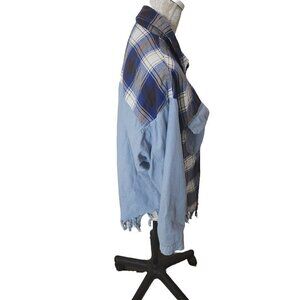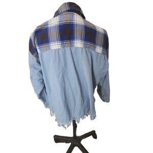 Womens Cato Blue Plaid & Chambray Frayed Hem 3/4 Sleeve button down Top Large