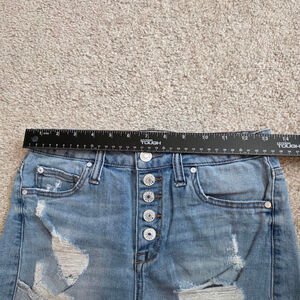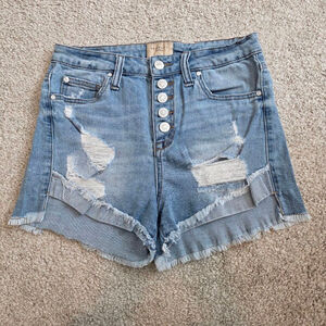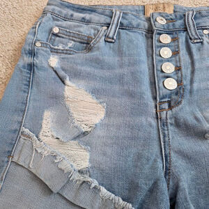 These are pre-owned Celebrity Pink denim shorts, size 5/27. The shorts are light blue and made of 99% cotton and 1% spandex. They feature a button-fly closure and a five-pocket design. The shorts have a frayed hem and distressed detailing with visible rips and tears. There are no stains or damage beyond the intentional distressing.