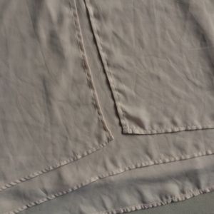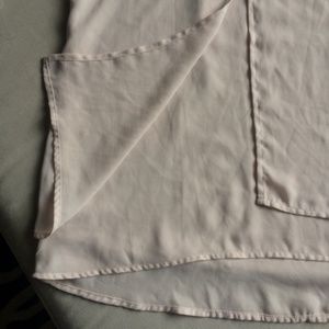 In like new condition. Beautiful light champagne colored top. Has double panel overlays on front of top. Gives it a lot of movement while wearing on. I believe straps are slightly haltered and come in near neck.