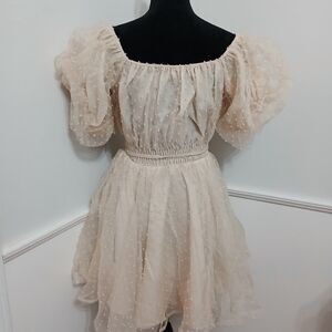 Women's Champagne Swiss Dot Puff Sleeve Babydoll Mini Dress Size L New