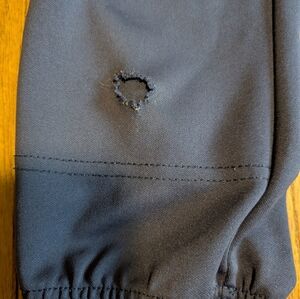 Stylish navy athletic pants with white side stripes. Perfect for sports or casual wear. Champro. Women's size medium. Has small hole at bottom of right leg as shown in picture.
