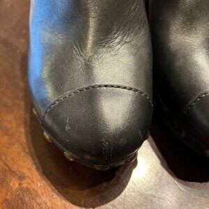 PRE-OWNED, MINOR SCUFF MARKS NEAR RIGHT SHOE TOE AND ON THE WOOD HEELS (SEE PICS) OTHERWISE; IN VERY GOOD CONDITION.