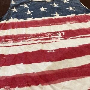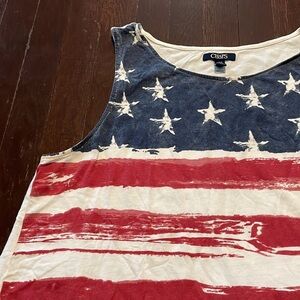Okay condition - Women's Chaps American Flag Fourth Of July Tank Top. Slight discoloration on back near armpits (as pictured). Colors: red, white, and blue. Size: L.