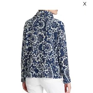 You'll love the cozy drawstring cowlneck drop shoulder boxy fit and pretty paisley print of this Chaps top.