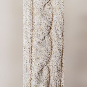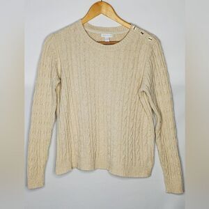 Women's Charter Club cable knit, crew neck sweater. Cream with a festive but subtle gold thread and three cream and gold buttons on the shoulder. Size medium.