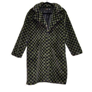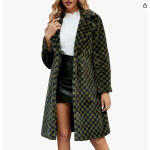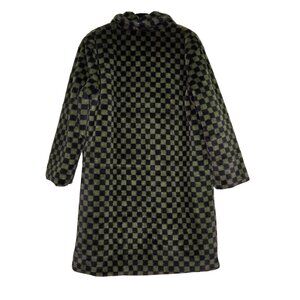 Womens Checkered Faux Fur Fuzzy Checkerboard Outerwear Coat Mid Length XL