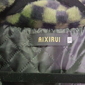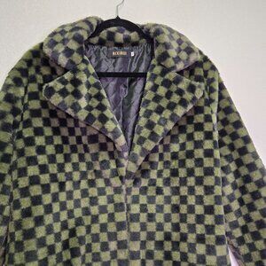 Tags/keywords: Checkered coat, checkerboard, faux fur coat, women's winter coat, oversized coat, green checkered coat, acrylic coat, warm women's coat, stylish coat, knee-length coat, long sleeve coat, eclectic, unique