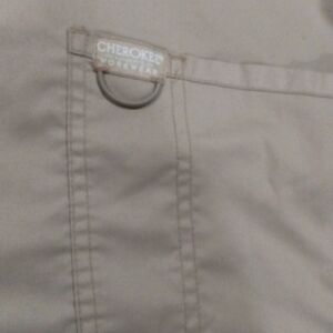 Womens Cherokee scrub top. Medium in size. Slightly worn, no stains. Khaki in color. Comes with three full front pockets and one pen pocket. V-neck, short sleeve. Measures about 21.5' across from pit to pit. Great condition.
