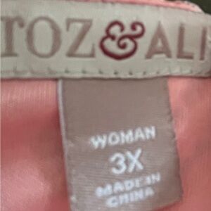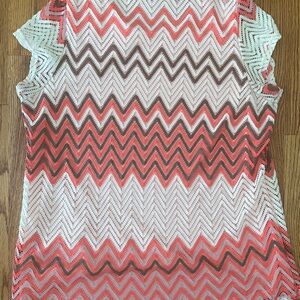 ROZ & ALI women's top featuring a vibrant chevron pattern. The coral pink, brown, white and light lavender add a trendy touch to your wardrobe. Size 3x. Fully lined bodice. Delicate wash. Dry flat. EUC