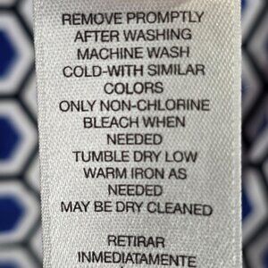 This Chico’s cotton button-up shirt offers a polished appearance with its no-iron feature and vibrant hexagon pattern. Designed for style and convenience.