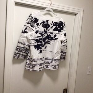 Abstract Floral and line design that’s enhanced by soutache accents on the front and sleeves