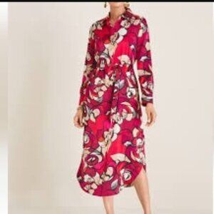 Elegant floral dress featuring vibrant red and cream colors. The length of the dress is 46". The underarm measurement flat is 22". The sleeve length is 23". The material is 100% polyester. It's a Chico's size 2 which is equivalent to a 12/14