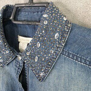 Womens Chicos Rhinestone Embellished Collar Denim Shirt Button Up Cotton Size 0