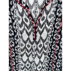 Up for sale is a red, white, and black abstract print surplice neck sheer blouse. 3/4 sleeves