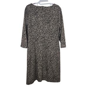 Excellent condition, women's Chico's "So Slimming" cheetah print (black and tan), knit, sheath dress. This dress is lined and has 3/4 length sleeves. This is knee length and has a back zipper closure.