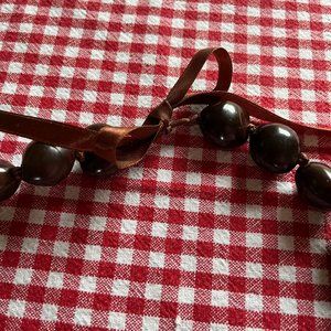 The brown "beads" are Hawaiian Kukui nuts about 1 inch in size. Choker style, 18" long. Clasp is a brown satin ribbon tie. Given as a gift and never worn. Likely from Carlyle (no tags). Strung on sturdy brown satin ribbon.