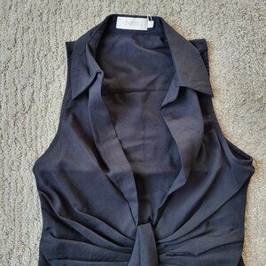 This chic and modern sleeveless mini dress from Choosy is designed with elegant details and a flattering fit. Featuring a deep plunge neckline (14" depth), gathered waist with tie, and a standard collar, it balances bold style with sophisticated tailoring. Hidden buttons run from the waist down to the hemline, while the inverted V front hem adds movement and flair.