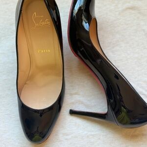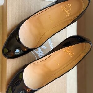 Women’s simple black pump 85 by Christian Louboutin. Size 39.5. These shoes are in immaculate condition and hardly ever worn as you can see in the pictures. There are no scuff marks anywhere on the shoe and the heel is in perfect condition. I did take them to a shoe shop and had protective pads put on the bottom of the shoes. These come in the original box with the original tissue paper and dust cover.