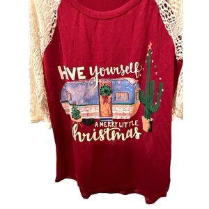 This festive top features a vibrant Christmas design with cactus and camper graphics, complemented by elegant lace sleeves. It offers a stylish holiday look.
